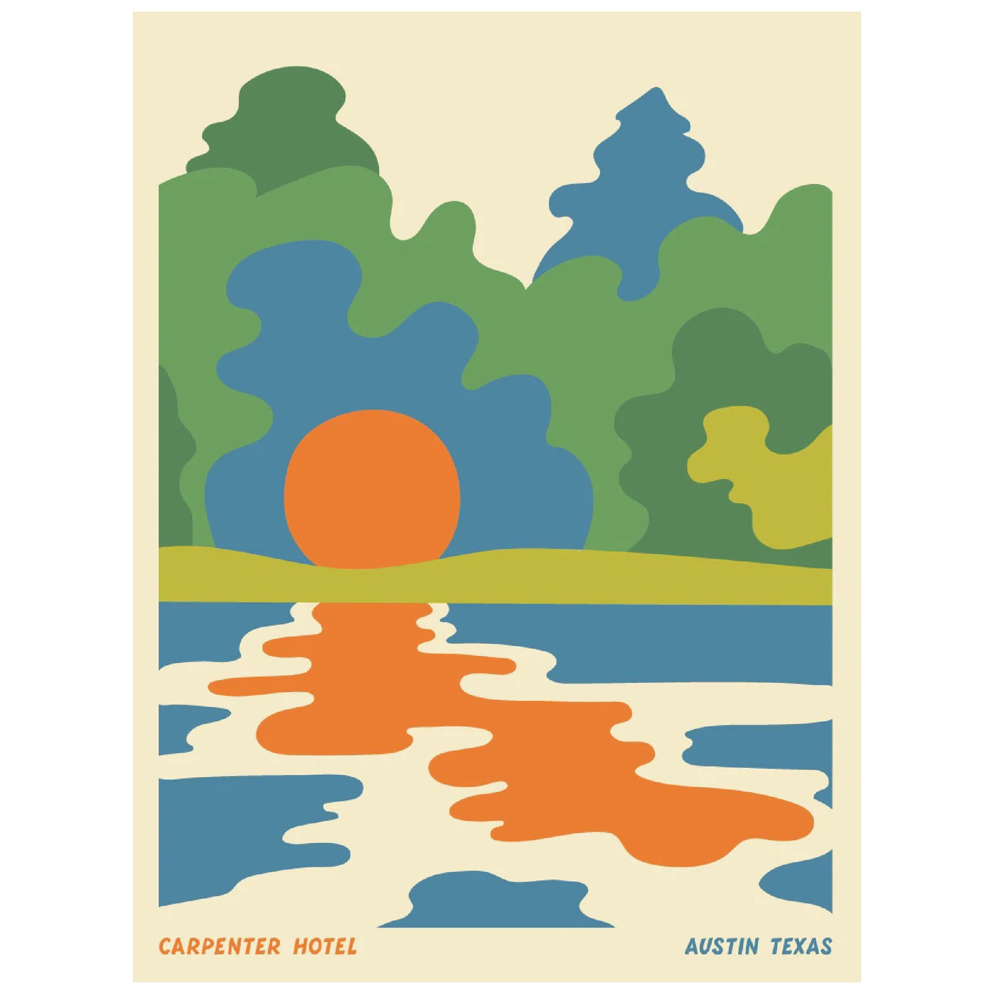 Inspired by Carpenter Hotel's location near Austin's iconic Barton Springs Pool and Lady Bird Lake. Designed by Hallie Brewer and printed by Bearded Lady in Austin, TX.