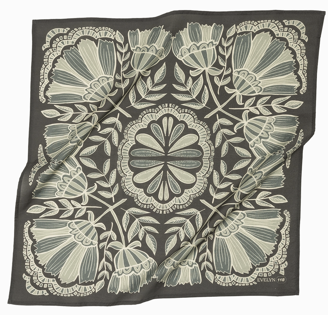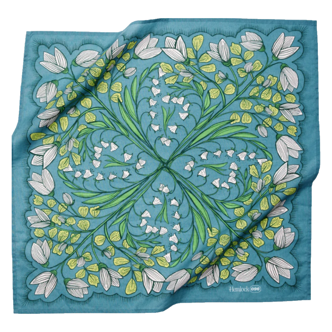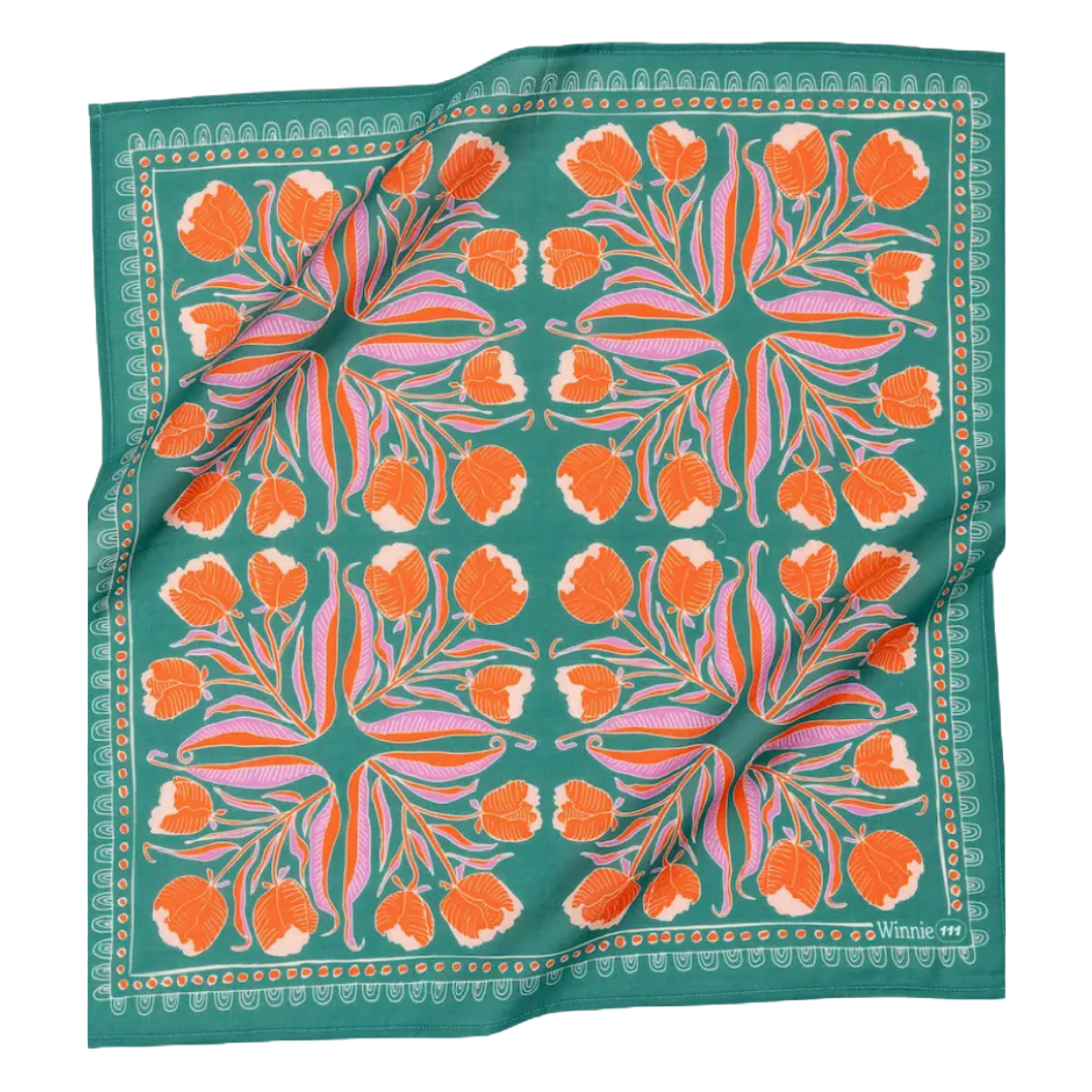Designed in Fulton, MO, by Hanker Bandanas and screen printed by hand in India on 100% cotton, these bandanas were made to be beautiful and tough. They can hold your hair back, clean up spills, and store your beloved treasures and favorite snacks. The possibilities are endless with these hardwearing, artfully designed handkerchiefs. 22"
